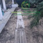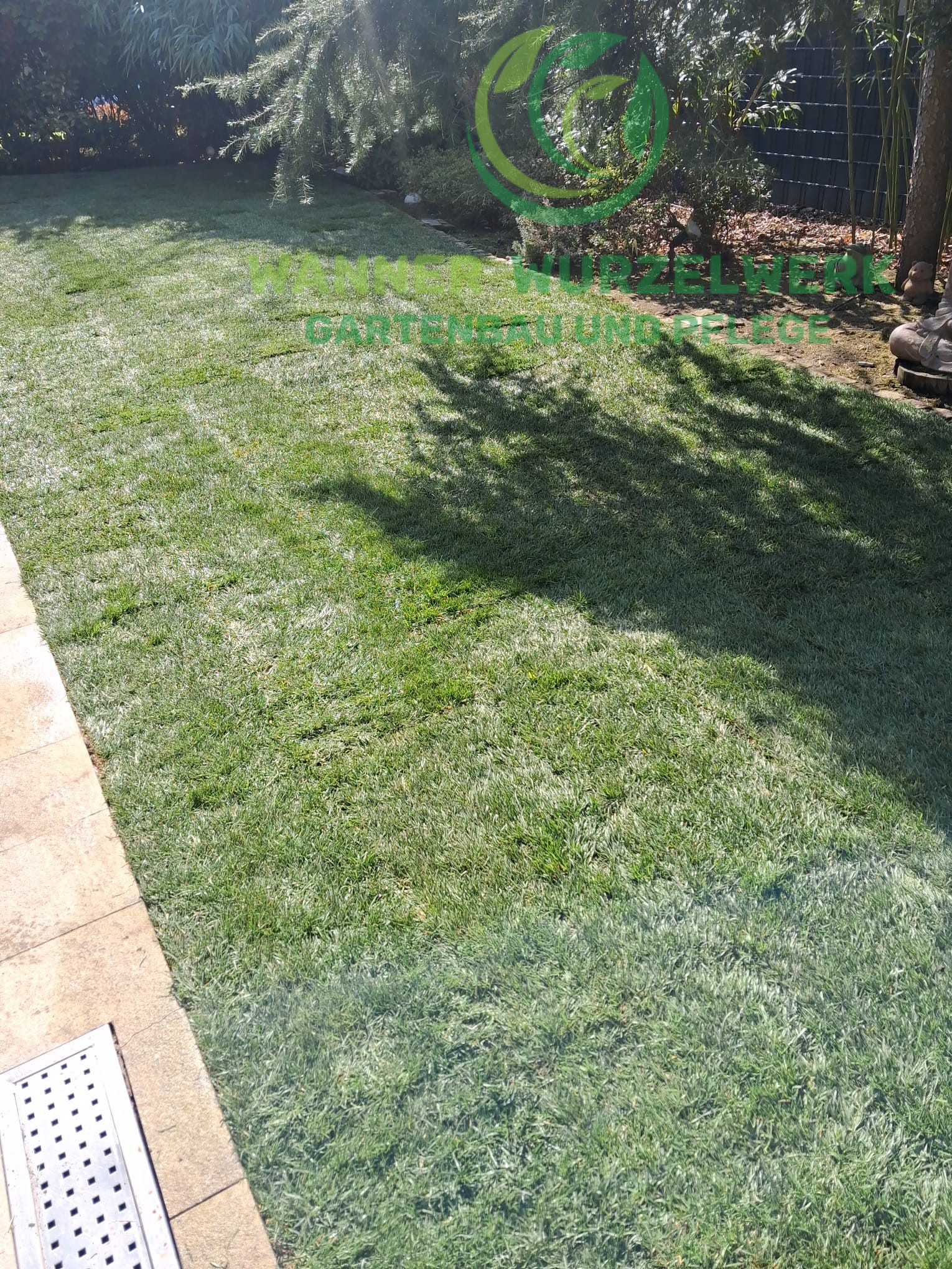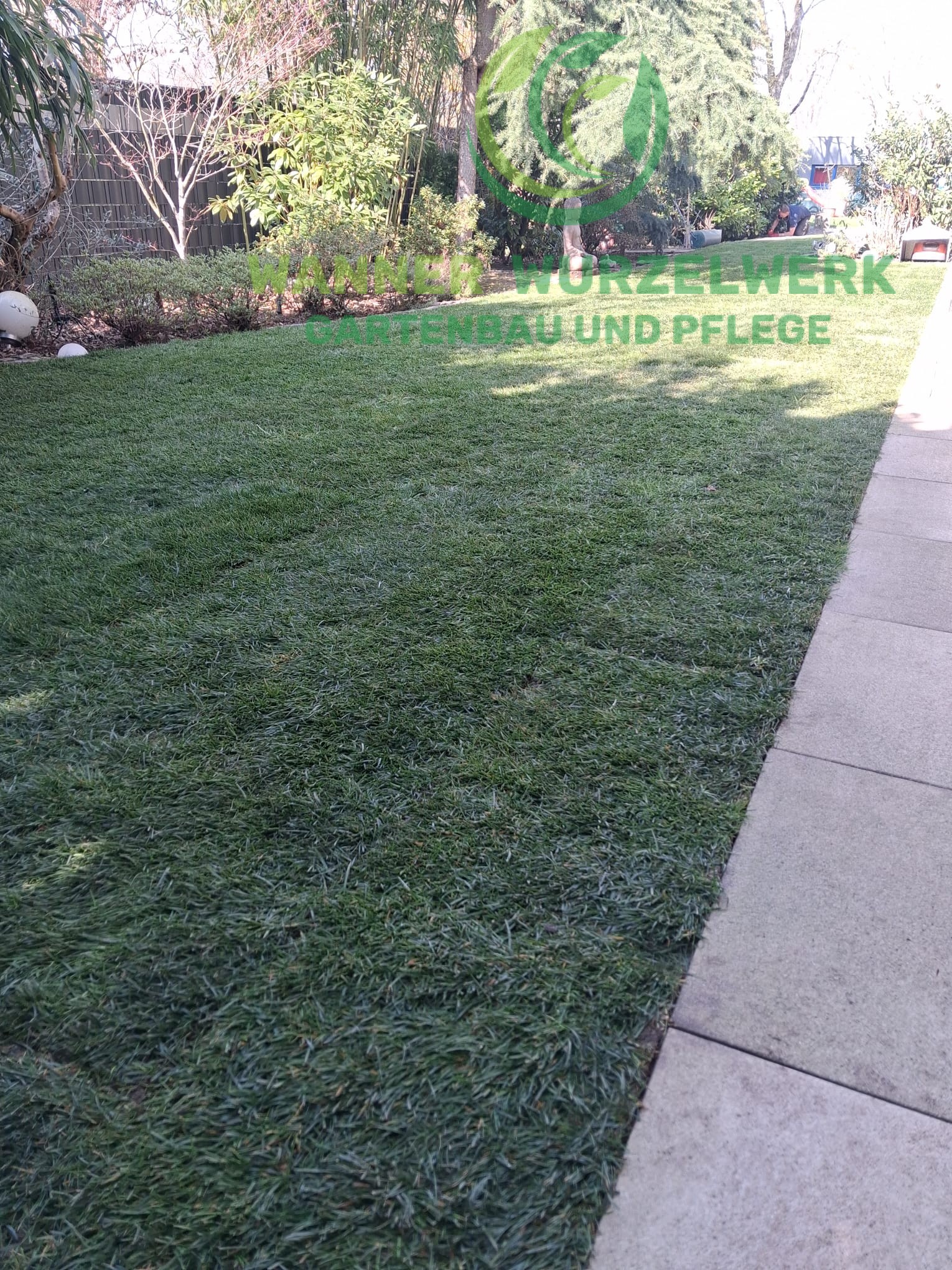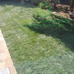 Im nächsten Schritt wurde der Rollrasen fachgerecht verlegt. Die Bahnen wurden passgenau aneinandergefügt, sodass eine geschlossene und gleichmäßige Rasenfläche entstand.